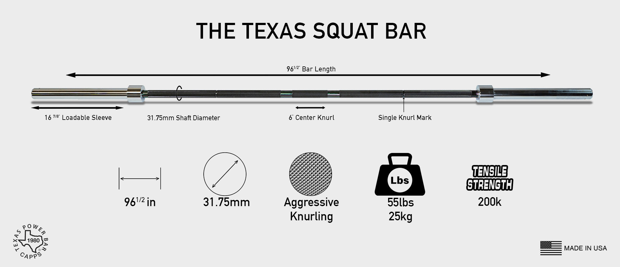 - Texas Squat Bar: A Thicker/Longer Shaft Drastically Increases Stiffness & Stability Compared To Standard Barbells. (USPA, IPL, + 1000's More Approved)