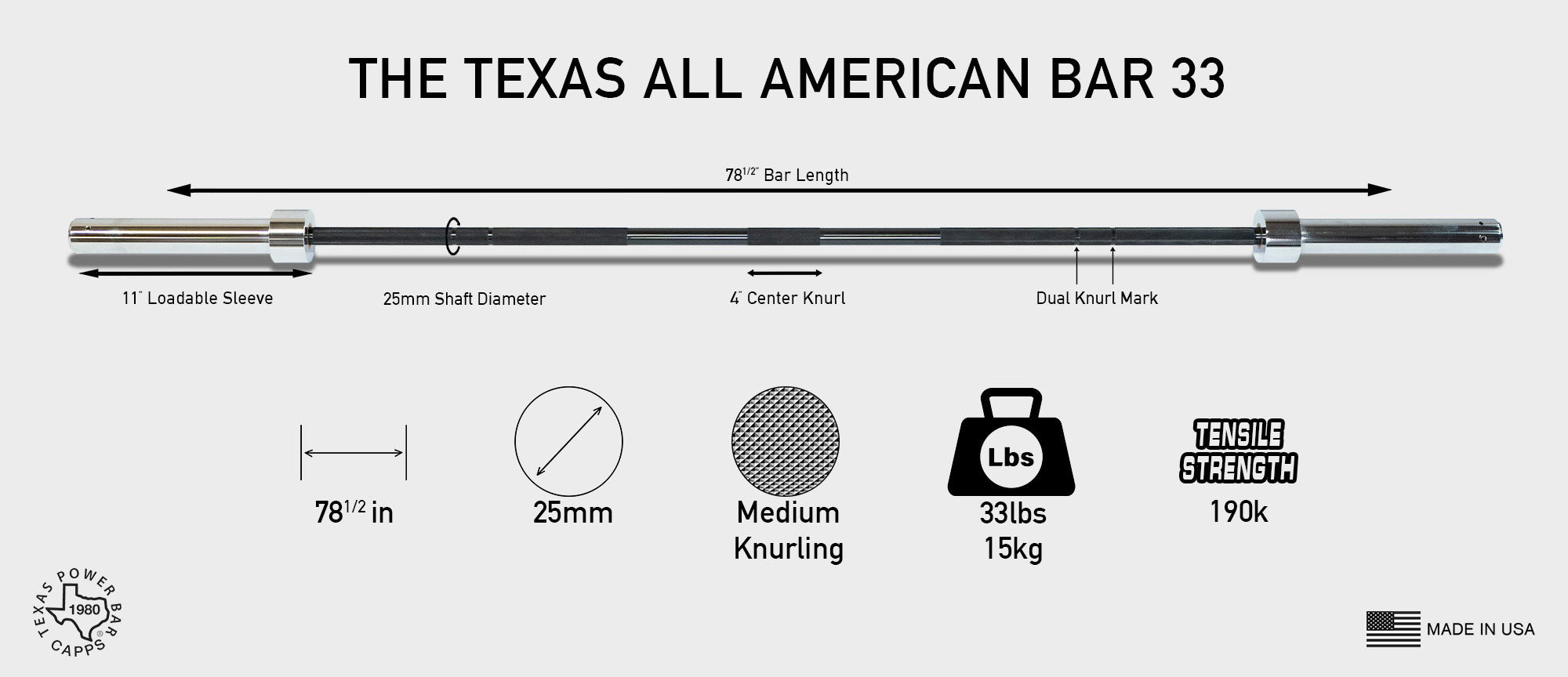 Over 100,000 sold since 1980, the Texas All-American Bar remains the best multi-purpose all-around barbell, handbuilt in Texas with a 45+ year legacy of outperforming and outlasting other bars, rep after rep. From home gyms to commercial facilities, from youth to seasoned athletes, this lighter 33 lbs / 15 kg variant ensures safe, effective training while unlocking the strongest version of you.