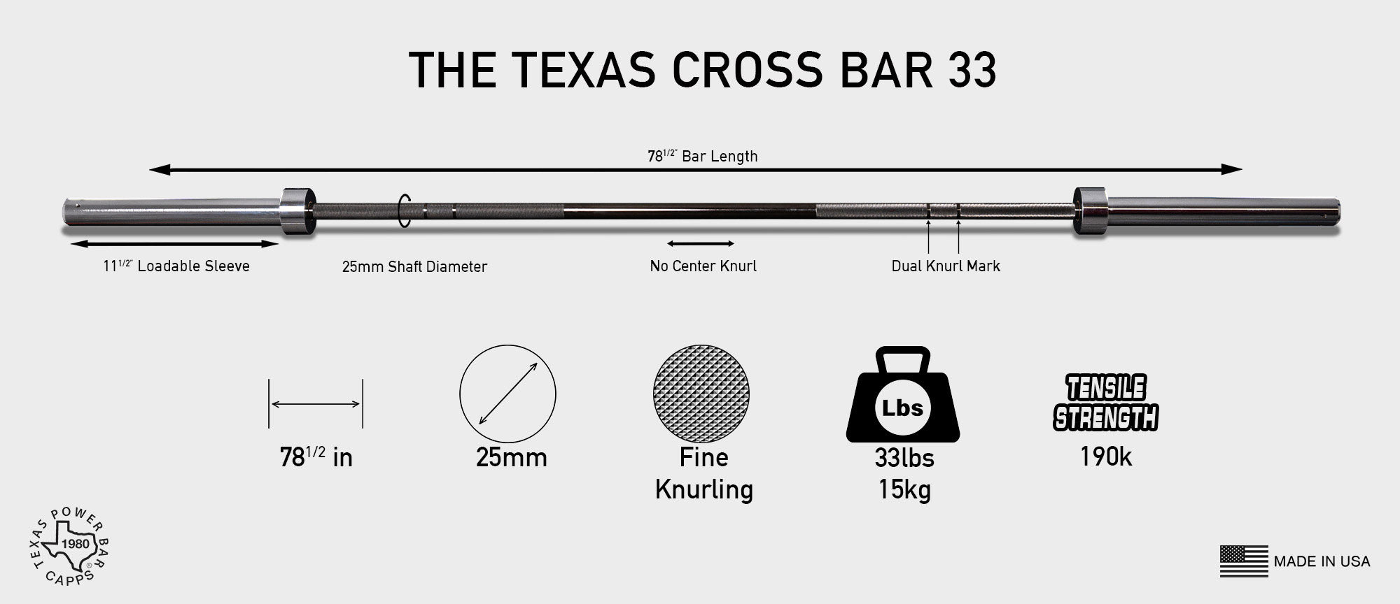 For over 45 years, the Texas Cross Bar has been the trusted choice for functional fitness and dynamic strength training. Handcrafted in Texas and proven in gyms worldwide, this lighter 33 lbs / 15 kg variant gives lifters of all levels the perfect tool for mastering technique, training safely, and unlocking peak performance—rep after rep, year after year.